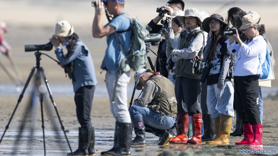 2025年11月9日,中外不雅鸟意思意思者在泉州围头湾滩涂上不雅测勺嘴鹬。新华社记者 魏培全 摄